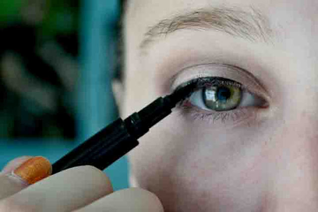 Now, Adele is famous for her dramatic cat-eye liner, so take a black liquid liner and draw a thin line all the way across your upper lashline. Make it thicker as you get to the outer corner and give it a little wing.